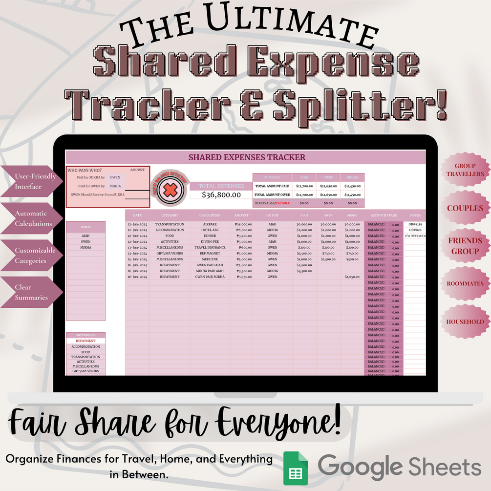 Description: The Shared Expenses Tracker and Splitter on Spreadsheet is the ultimate solution for effortlessly managing shared expenses among group travelers, couples, friends, roommates, and households. Designed to make expense tracking a breeze, this user-friendly tool ensures transparency and fairness in managing shared costs.